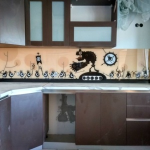 Скинали с необычным изображением для коричневой кухни. Рисунок нанесенный на скинали сохраняет свои цвета и не выцветает под воздействием солнечного света.
